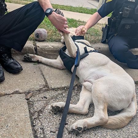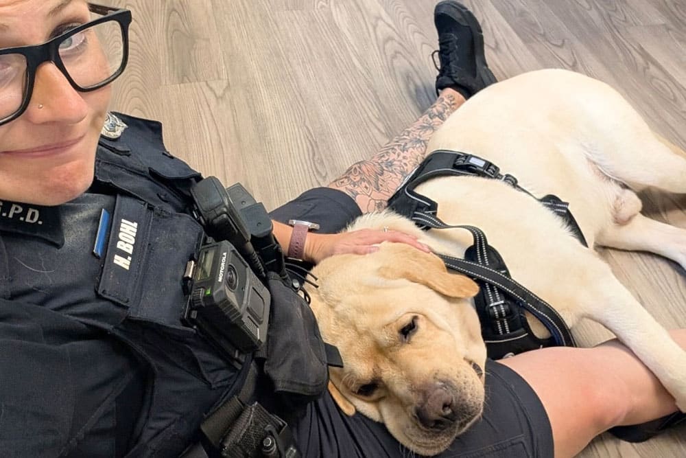 She explained Tiggy’s primary work is for police and staff. “Our [police] stress hormones are higher,” she said. “Fifteen minutes with a dog after an incident lowers cortisol levels by 20 percent.” Tiggy’s therapy interactions aren’t always just for assisting officers, though. Bohl said sometimes when victims are inside the police building, he is brought in to calm children and adults alike.