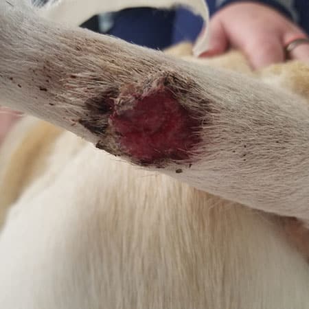 Mueller said blastomycosis is endemic in Wisconsin. It is a disease that occurs when a pet disturbs soil, or decomposing organic matter like leaves, that are contaminated with the fungus. The pet inhales the spores, which then start damaging and spreading in the lungs. Sometimes the illness presents with more respiratory-related symptoms, but other times it’s more like what Tiggy experienced with skin-related troubles.